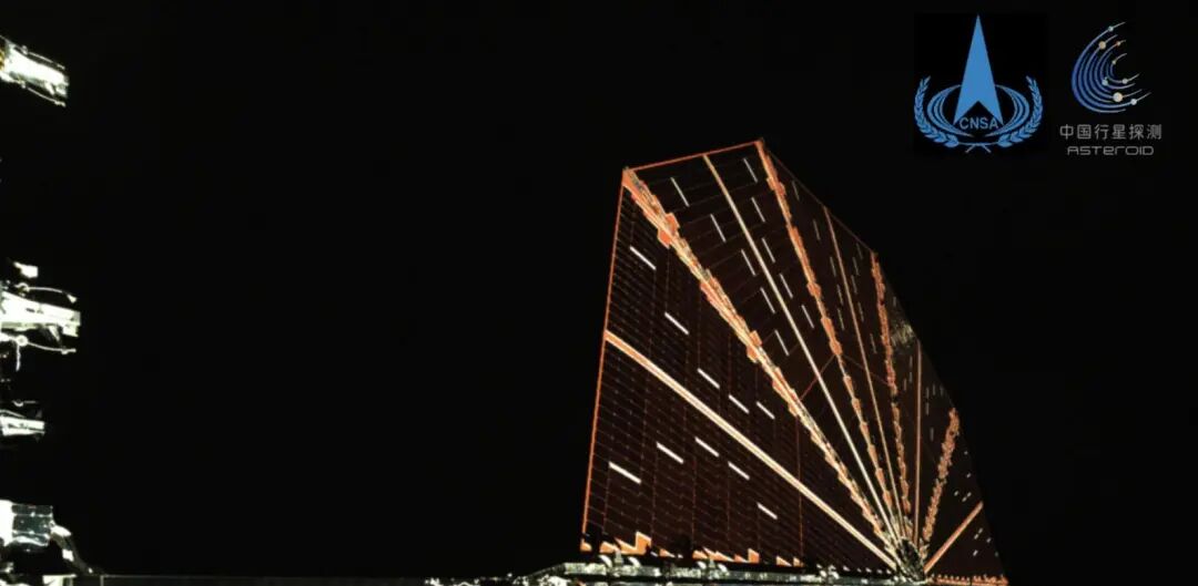 国家航天局发布的“天问二号”探测器在轨飞行正常圆形柔性太阳翼展开图片: