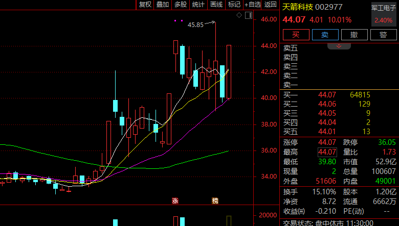 商业航天与卫星导航概念股活跃。星辰科技触及30%涨停,天银机电快速20%涨停,创历史新高,盛洋科技连续第2日一字涨停,神剑股份仅约3分钟由跌逾1%垂直拉涨停,天箭科技同样约3分钟涨停,顺灏股份5分钟涨停,中国卫星等逾10股强势涨停或涨超10%。