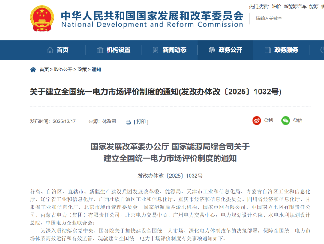 12月18日消息,昨日晚间,国家发展改革委办公厅、国家能源局综合司联合发布《关于建立全国统一电力市场评价制度的通知》。其中明确:全国统一电力市场评价工作应结合市场建设情况开展多维度综合评价,重点围绕电力市场运营效果、市场作用发挥、经营主体可持续性发展、市场竞争充分度四个方面开展评价。