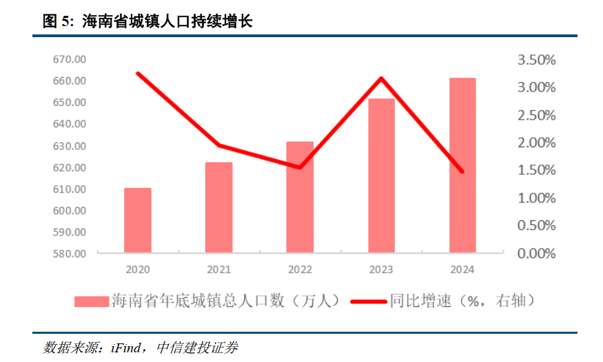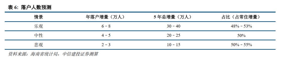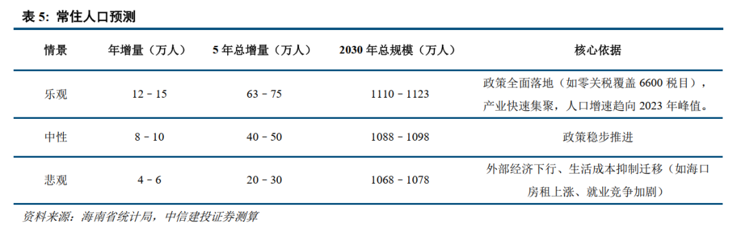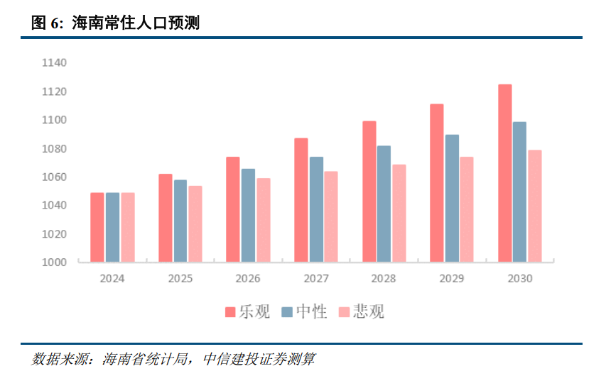 2024年末海南常住人口为1048.31万人,自然增长率3.06‰,乐观情况下,封关运作有关政策全面落地,产业快速集聚,人口增速趋向2023年峰值,落户人数年均增量达6-8万人;悲观情况下,外部经济下行、生活成本抑制人口迁移,落户人数年均增量2-3万人。
