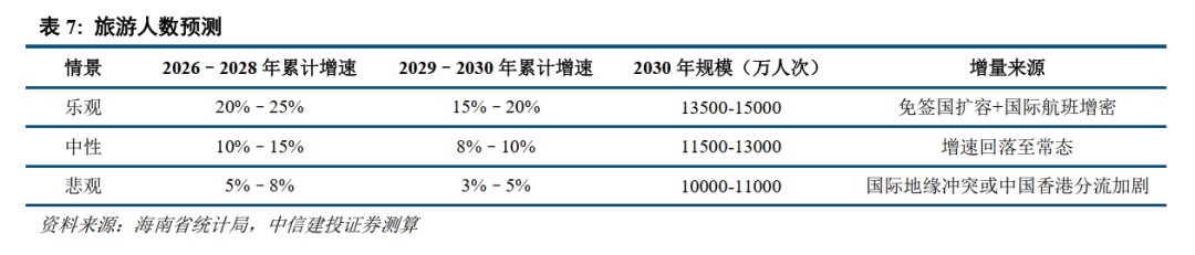 2024年海南旅游经济稳健发展,全省接待游客9720.78万人次,同比增长8%,创历史新高;游客总花费突破两千亿元大关,达到2040.14亿元,同比增长12.5%。2023年海南省接待国内外游客9000.62万人次,旅游总收入1813.09亿元,分别同比增长49.9%和71.9%,对比2019年分别增长8.3%和71.4%。说明海南旅游发展已恢复并超越疫情前水平。乐观情况下,免签国扩容、国际航班增密,来港消费人数显著增加,带动游客增速5年累计达35%-40%;悲观情况下,受国际地缘冲突或中国香港分流加剧等影响,游客增速5年累计达10%-12%。