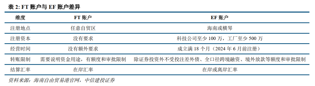 相比于传统FT账户,EF账户在开户方面受到注册地点、注册资本、注册时间等方面的限制,两个账户不能同时拥有,若主体已开立FT账户且满足EF账户开立条件,需注销原FT账户,转而开立EF账户。