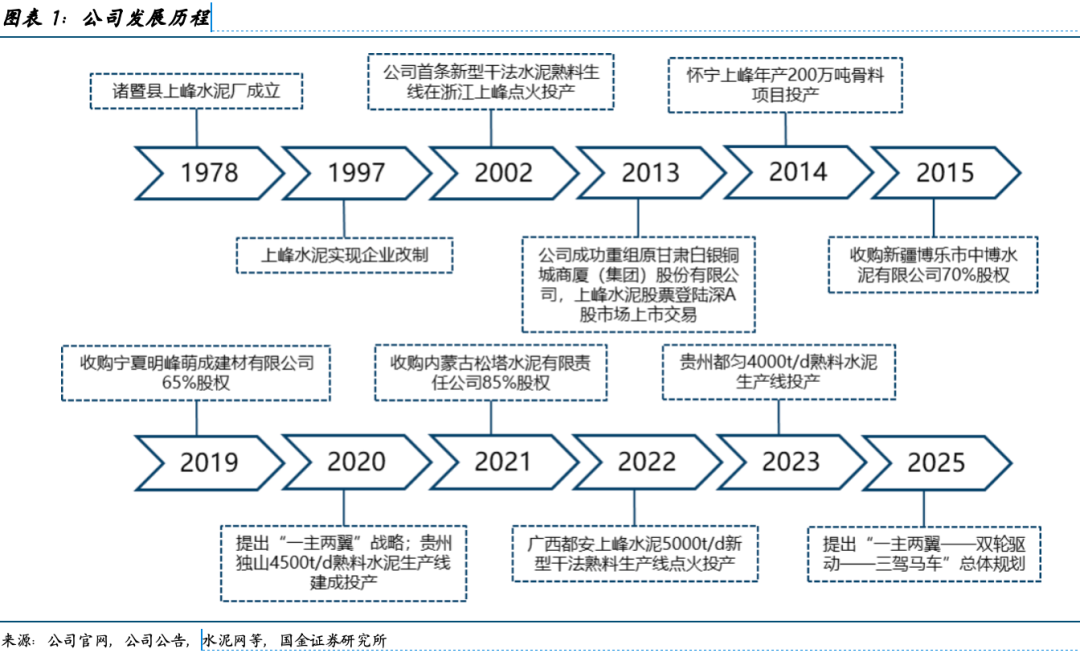 水泥主业立足华东核心市场,延伸拓展西北、西南。公司前身上峰水泥厂成立于1978年,2013年4月通过重组“*ST铜城”在深交所借壳上市,总部浙江杭州。公司主营熟料、水泥、骨料的生产制造和销售,以华东市场为核心,逐渐延伸布局西北(新疆 内蒙古 宁夏)、西南(广西 贵州)。截至2025H1,公司具备水泥熟料年产能约1800万吨,水泥年产能约2000万吨,拥有新型干法水泥熟料生产线12条(下半年产能置换和转出有所调整)。