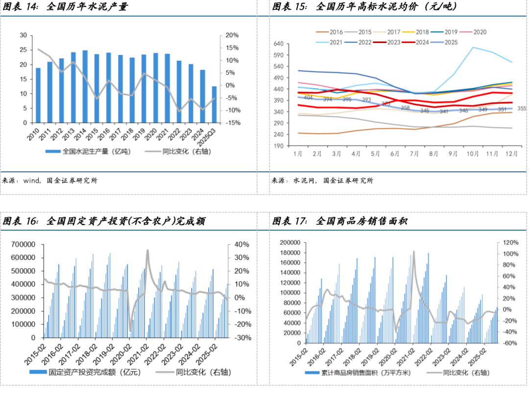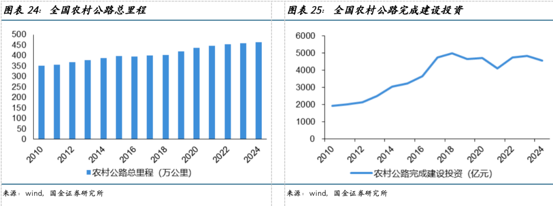 相关政策托底水泥需求。2025年9月《农村公路条例》正式施行,旨在推动农村公路高质量发展。截至2024年底,我国农村公路总里程达464.4万公里,自2006年起保持2.4%复合增长率,占全国公路总里程近85%;按技术等级看,等级公路占比达97.3%,仍有部分存在升级为等级公路的需求。此外,《2024年交通运输行业发展统计公报》显示,农村公路建设投资连续8年保持在4000亿元以上,全年新改建农村公路里程达16.41万公里;交通运输部今年4月24日举行例行新闻发布会提出,全年计划新改建农村公路10万公里,新增通三级及以上等级公路乡镇250个。假设新建1公里农村公路需要210吨水泥(路面混凝土最小单位水泥用量大约300kg/立方米,非冻土乡村道路路面宽度3.5米、厚度20cm,据此推算1km路面所用混凝土为700立方米,对应水泥用量210吨),按新建总公里数10万公里测算,预计拉动水泥年需求2000万吨以上。