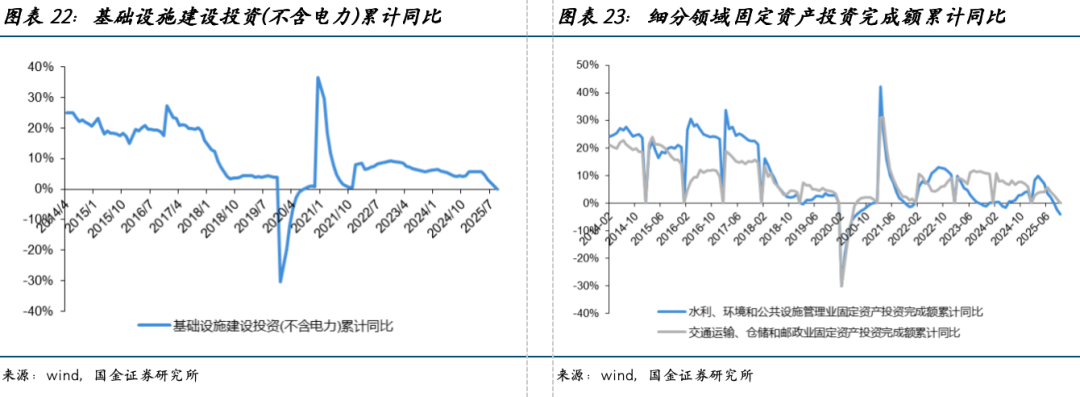 基础设施投资增速持续放缓。截至2025年10月,基础设施投资(不含电力、热力、燃气及水生产和供应业)同比下降0.1%,自2021年起首次转为负增长。