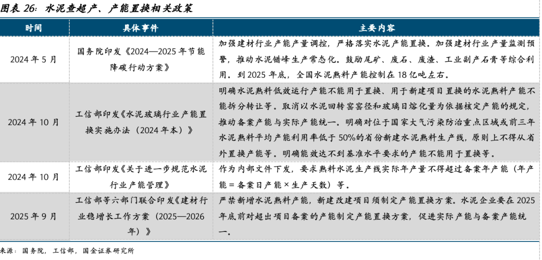 查超产、产能置换等政策有望推动供给端边际改善。2024年5月,国务院印发《2024—2025年节能降碳行动方案》,提出到2025年底,全国水泥熟料产能控制在18亿吨左右;2024年10月,工信部印发《水泥玻璃行业产能置换实施办法(2024年本)》,旨在加严水泥置换要求,明确水泥熟料低效运行产能不能用于置换等,推动备案产能与实际产能统一;2024年10月,工信部印发《关于进一步规范水泥行业产能管理》,作为内部文件下发,要求熟料水泥生产线实际年产量不得超过备案年产能(年产能=备案日产能×生产天数)等;2025年9月,工信部等六部门联合印发《建材行业稳增长工作方案(2025—2026年)》,提出水泥企业要在2025年底前对超产产能制定产能置换方案,促进实际产能与备案产能统一。