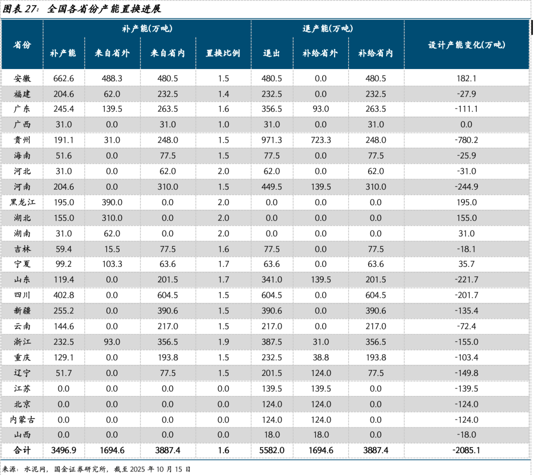 截至2025年10月15日,我国累计补充产能3496.9万吨,退出5582万吨,净减2085.1万吨;分区域看,黑龙江、安徽、湖北为补产能最多的三个省,分别补充设计产能195.0、182.1、155.0万吨,贵州、河南、山东、四川产能退出明显,分别减少设计产能780.2、244.9、221.7、201.7万吨。安徽、湖北等区域水泥企业集聚、石灰石资源禀赋优越,是海螺水泥、华新水泥等行业龙头的总部所在地,在产能置换过程中,龙头企业倾向于优先稳固其核心区域熟料产能布局,因此上述地区补充产能较多;其他区域如贵州近年来面临需求收缩、供给冲击、预期转弱的三重压力,水泥需求下跌,多数产能指标补给省外。