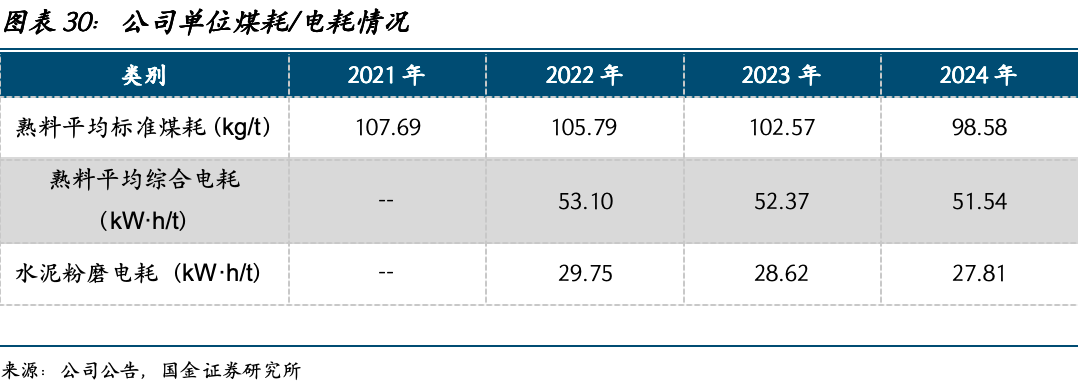 公司持续推进降本增效。公司生产成本受煤炭、电力价格和原材料采购成本影响较大,在煤炭采购方面,公司已建立长期稳定的供应渠道,并持续优化采购管理模式,通过拓展渠道、减少中间环节以及实行集中采购、统一议价等方式,提升规模效应、降低煤炭采购成本;电力主要由属地供电局供应,公司正通过余热发电及光伏发电逐渐降低电力成本,目前各熟料生产线均配备了余热发电系统,2024年年余热发电能力约86MW,光伏发电装机容量23.59MW,当年累计利用余热发电4.73亿度,光伏发电1870万度;2022年公司熟料综合电耗53.10度/吨,水泥粉磨综合电耗29.75度/吨,到2024年分别降至51.54度/吨、27.81度/吨,2023-24年受益光伏发电累计减少外购电支出1880万元。