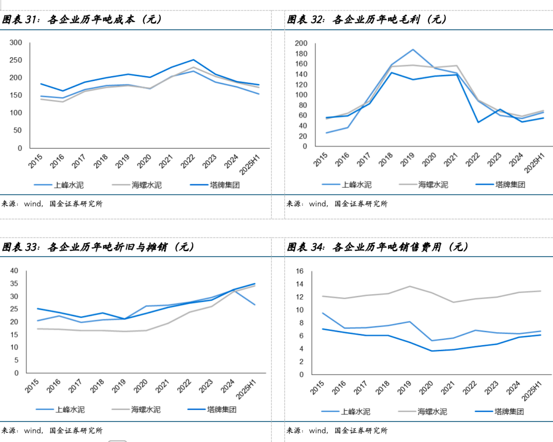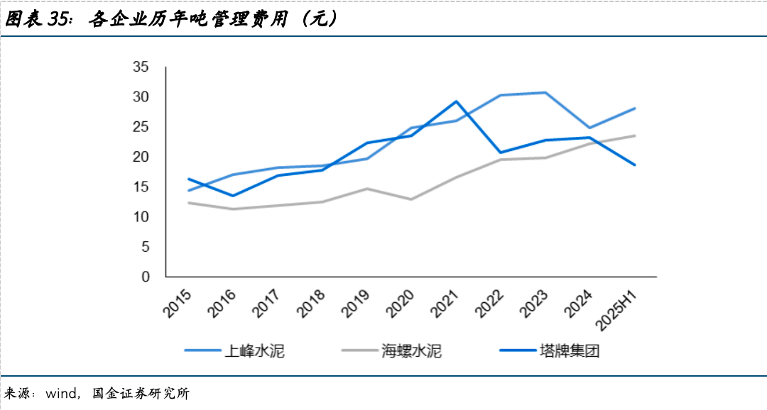 2025上半年公司吨折旧与摊销逆势出现下降拐点,仅为26.80元,同期海螺水泥(34.14元)、塔牌集团(34.96元)较2024年均有所上升。费用方面,公司吨销售费用6.78元在样本公司中较低,接近塔牌水泥6.16元的水平,显著低于海螺水泥(12.97元);公司吨管理费用为28.07元,较海螺水泥(23.53元)和塔牌集团(18.74元)仍有进一步优化空间。