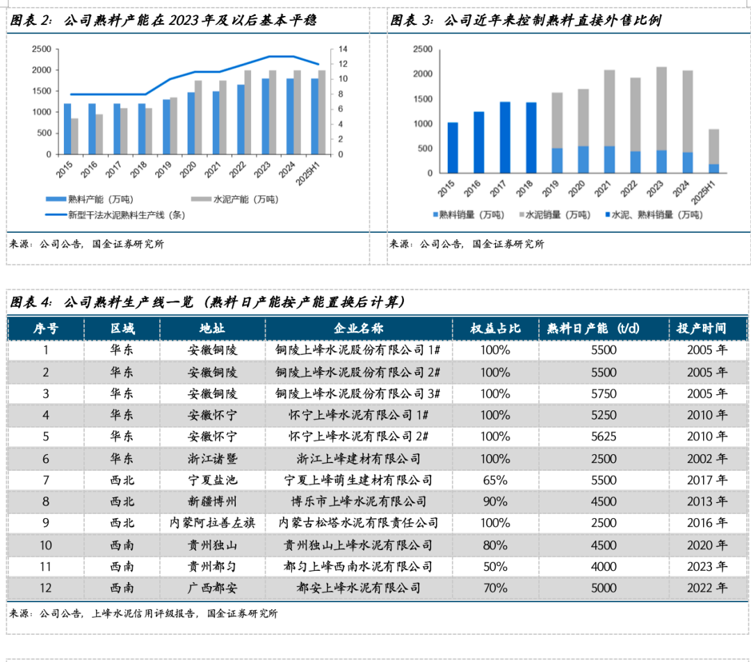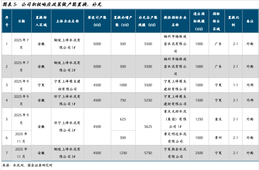 2025年转出吉尔吉斯斯坦项目,退出宁夏上峰萌生建材1条2500t/d熟料生产线,补充宁夏上峰、安徽铜陵上峰、怀宁上峰共6条熟料生产线5125t/d熟料产能。