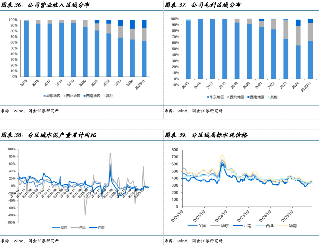 公司以华东区域为核心,稳步向西部、南部延伸。西北区域方面,2015年公司收购博乐市中博水泥70%股权(2019年增持至90%),2019年收购宁夏明峰萌成建材65%股权,2021年再收购内蒙古松塔水泥85%股权,逐步完善在西北地区的产能布局。西南方面(公司把广西划为西南),公司近年来以新建熟料生产线为主推进扩张:2020年贵州独山4500t/d新型干法熟料生产线投产,2022年广西都安上峰5000t/d熟料线点火,2023年贵州都匀4000t/d熟料水泥生产线建成投产,公司在西南区域的产能和市场覆盖持续提升。2015年公司华东地区营业收入占比98.46%,毛利占比97.27%,2025年上半年公司华东地区营业收入、毛利占比缩减至63.04%、62.75%,西北地区营业收入、毛利占比22.29%、30.56%,西南地区营业收入、毛利占比14.67%、6.70%。