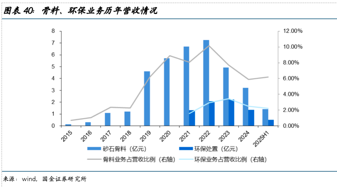 “骨料 环保处置”多业务协同发展。截至2024年末,公司拥有骨料产能1800万吨,未来骨料目标年总产能4000万吨。公司2014年切入骨料业务,2019年起发展明显加速,2023年受下游需求走弱影响,骨料业务收入阶段性回落。2025年上半年骨料业务实现收入1.41亿元,占营业收入6.20%,得益于骨料行业整体毛利率较高,同期毛利率为64.30%,显著高于水泥、熟料约30%水平,当期对公司毛利贡献比例达12.53%。