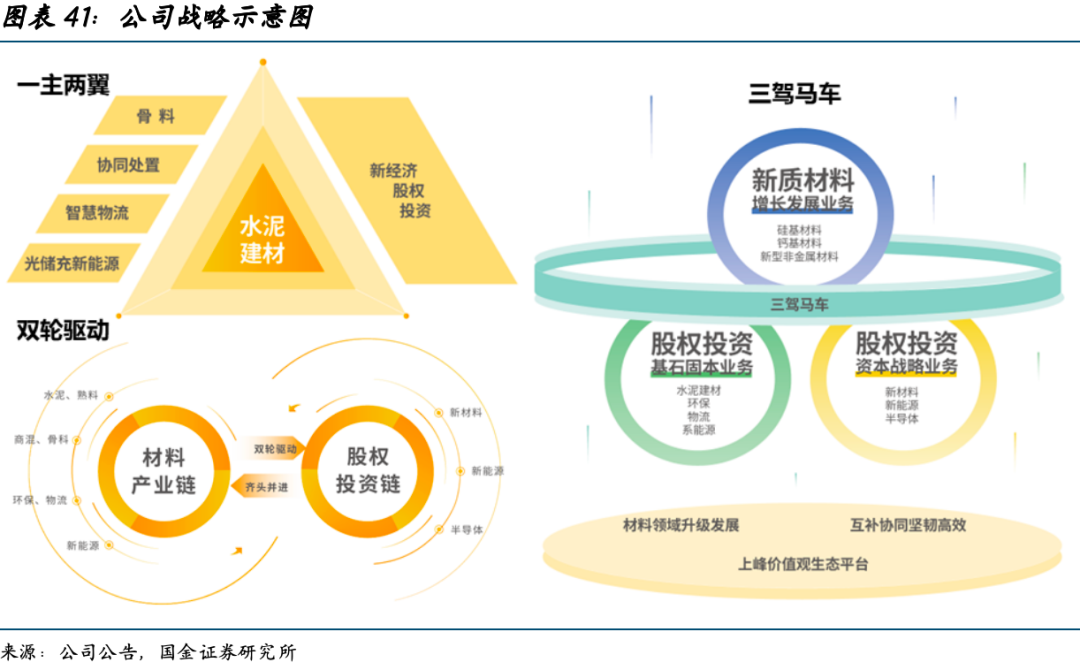 公司2020年提出“一主两翼”战略,确定围绕水泥建材 骨料环保 投资3条发展主线,2025年升级为“一主两翼——双轮驱动——三驾马车”总体规划,力求主业基石产业链、新经济股权投资链、第二成长曲线业务链三个板块协同发展,打开成长空间。