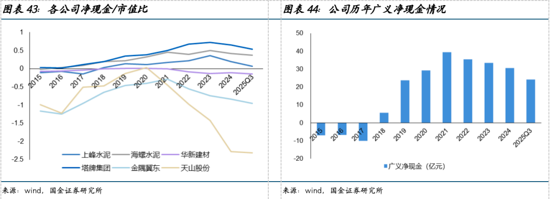 截至2025年三季度末,公司净现金为6.56亿元,对应净现金/市值约0.06,虽低于海螺水泥、塔牌集团当前的净现金占比,但在同业中仍处于相对稳健水平。公司2025年净现金/市值比明显回落,主因净现金在2024年由2023年的28.5亿元降至14.0亿元,当年公司利用闲置资金新增6亿元委托贷款(计入其他流动资产),并购买期限超过一年的银行大额存单本息7.52亿元(计入其他非流动资产),从而在账面上压缩了净现金规模。