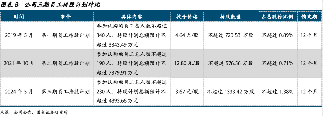 公司已推出多期员工持股计划,2019年5月、2021年10月提出第一、二期,2024年5月第三期计划公告拟向不超过230人(其中董监高不超过12人)以受让价格3.67元/认购股数合计不超过1333.4221万股,占当前总股本的1.376%。