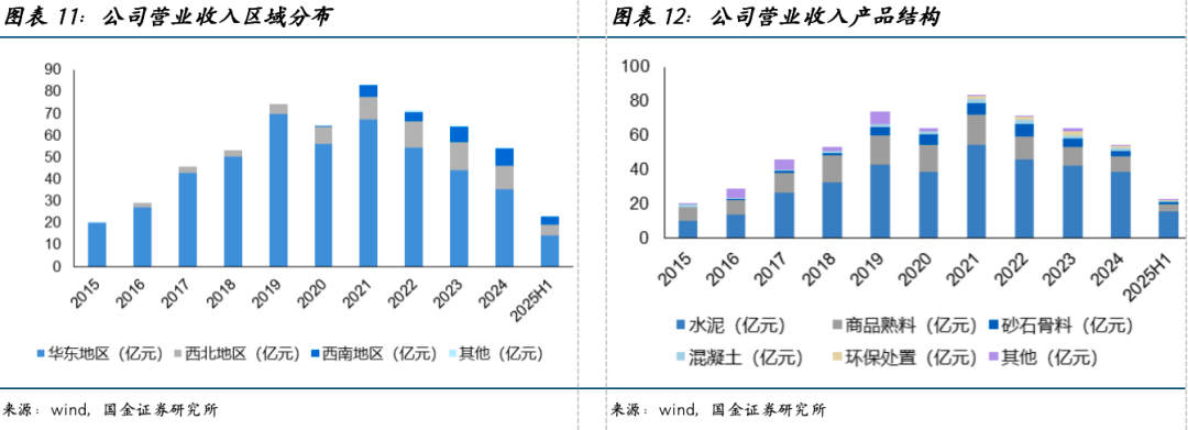 水泥行业上升期曾加快跨区域布局。2025上半年公司华东区域实现营收14.33亿元、占比63.04%(2019年93.85%),西北地区营收5.06亿元、占比22.29%,西南地区营收3.33亿元、占比14.67%。