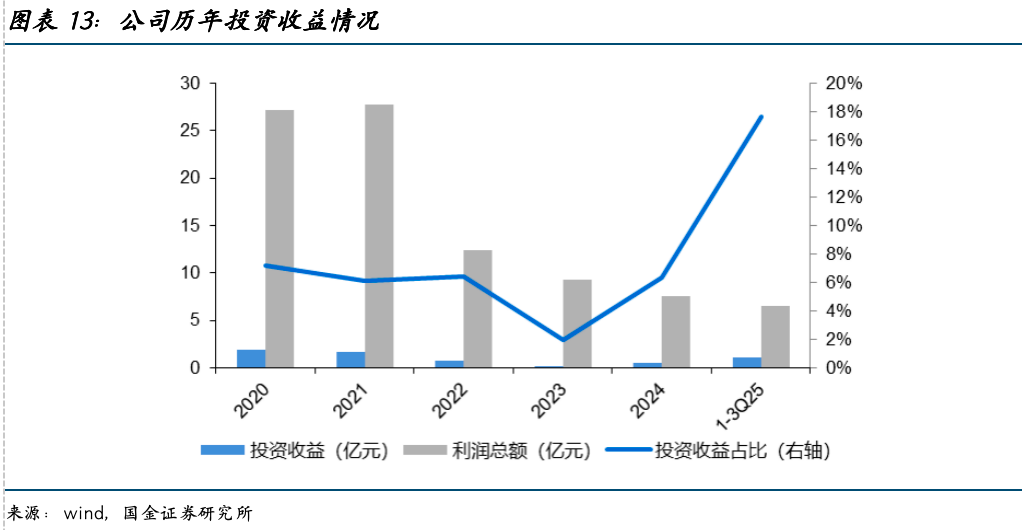新经济股权投资回报丰厚。投资业务作为“一主两翼”战略重要一翼,其资产主要计入“长期股权投资”和“其他非流动金融资产”(晶合集成因上市成功曾计入“交易性金融资产”),取得收益主要通过“投资收益”科目核算,2020-2025Q3公司累计实现投资收益6.26亿元,同期公司累计利润总额90.76亿元,投资收益占比6.90%;2025年前三季度公司利润总额为6.52亿元,投资收益为1.15亿元,对利润贡献17.64%。