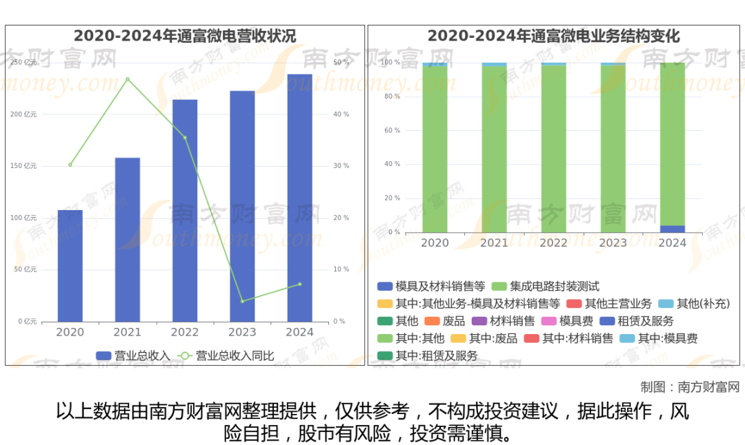 通富微电财务数据显示(如上图): 2024年实现营业总收入 238.82亿,同比增长7.24%。近五年复合增长率(CAGR)为22.03%。