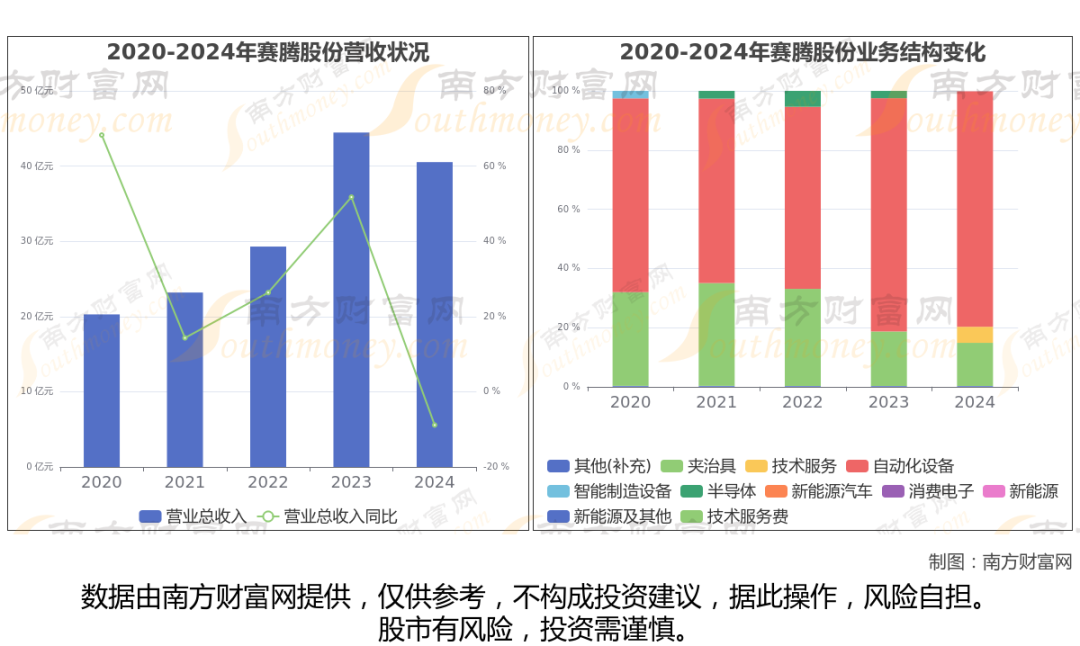 数据显示(如上图),赛腾股份公司2024年营业收入40.53亿,同比增长-8.85%,近5年复合年增长率(CAGR)18.89%。