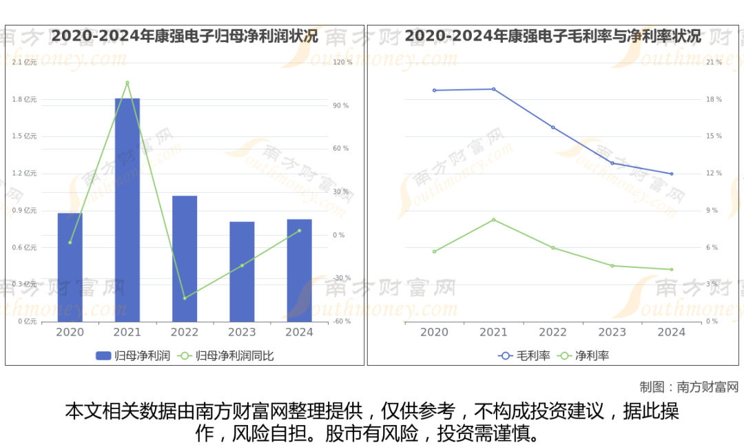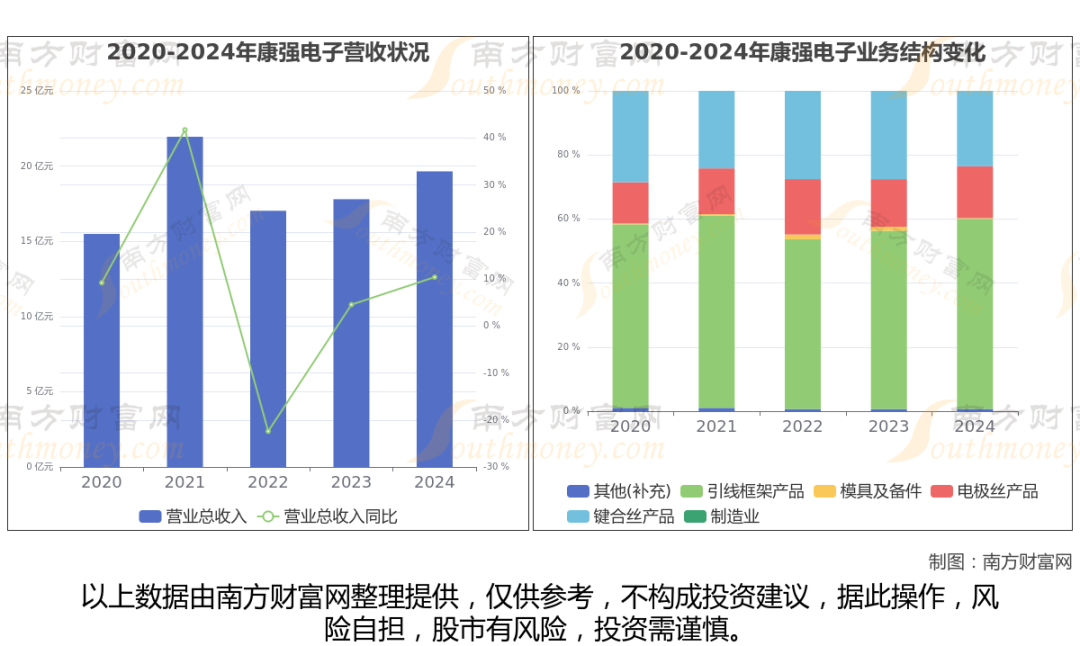 根据公司年度数据显示(如上图),2024年,康强电子实现营业总收入19.65亿,同比增长10.38%,近5年复合年增长率6.13%。