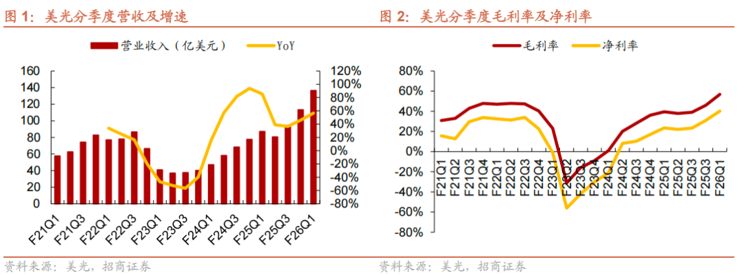 美光于12月18日公布FY26Q1财报,营收136.4亿美元,同比 57%/环比 21%;毛利率56.8%,同比 11.1pcts/环比 11pcts。