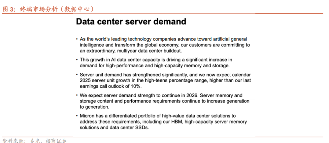 全球领先科技企业向AGI迈进,推动大规模多年期数据中心建设,极大地带动了对高性能、大容量内存和存储产品的需求。服务器设备需求显著增长,预计2025 日历年服务器出货量增长率将达到高teens区间,高于上一次财报电话会议预测的10%,且2026年服务器需求将持续强劲。