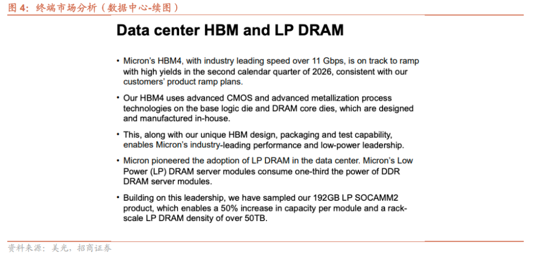 2026财年第一季度,数据中心NAND产品组合营收突破10亿美元。美光凭借 HBM、大容量服务器内存产品和数据中心SSD等差异化高价值解决方案,满足了服务器内存和存储逐代提升的容量及性能要求。同时,美光是数据中心LPDRAM应用的先驱,其LPDRAM服务器模组功耗仅为DDR DRAM服务器模组的三分之一,且已推出192GB LP SOCAMM2产品样品,使每个模组的容量提升50%,机架级LPDRAM密度超过50TB。
