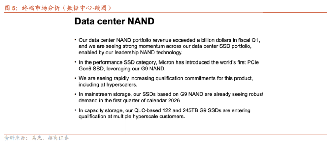 NAND技术:在NAND领域,美光连续三个技术节点处于领先地位,且每个节点的良率提升速度不断加快。目前正推进G9节点的量产,数据中心和客户端SSD的良率均稳步提升,本季度包括G9 QLC在内的QLC NAND产品占比达到历史新高。2026日历年,向G9节点的技术过渡将成为NAND位容量增长的主要动力,预计在2026财年下半年,G9将成为最大的NAND技术节点。