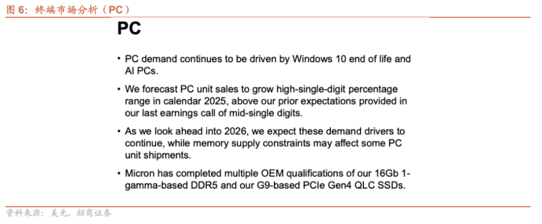PC需求持续受到Windows 10系统终止支持和AI PC的推动,预测2025日历年PC出货量增长率将达到高个位数区间,高于上一次财报电话会议预测的中个位数。展望2026年,这些需求驱动因素将持续存在,但内存供应限制可能会影响部分PC出货量。美光基于1-Gamma技术的16Gb DDR5产品,以及基于G9技术的PCIe Gen4 QLC SSD已通过多家OEM的认证。