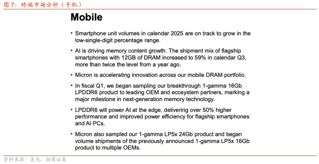 1)数据中心:FY26Q1数据中心和HBM营收均创下季度新高,已经完成HBM 2026年的供应价格和销售协议,上修HBM TAM 2028年至1000亿美元,复合增速40%。预计HBM4在FY26Q2出货,并上调2025年服务器出货量预期至高十位数百分比;2)PC:进一步上调2025年PC出货量增长至高个位数百分比,增长仍然系Windows 10的生命周期终止以及AI PC的加速普及;3)手机:维持2025年智能手机出货量增长低个位数百分比,搭载12GB以上内存智能手机出货占比已增至59%,同比增长两倍多;4)汽车:ADAS和AI车载娱乐系统推动内存需求,已获得数十亿美元的设计中标。