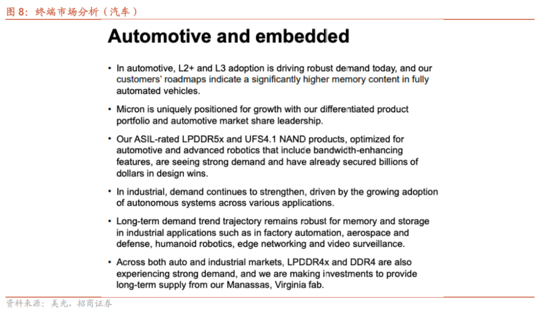 汽车领域,L2 和L3级自动驾驶的普及推动强劲需求,客户路线图显示全自动驾驶汽车的内存容量将大幅提升。美光符合ASIL标准的LPDDR5X和UFS 4.1 NAND产品针对汽车和先进机器人进行了优化,具备带宽增强特性,目前需求强劲,并已获得数十亿美元的设计订单;工业领域,受各类应用中自主系统采用率不断提高的推动,需求持续走强,工厂自动化、航空航天与国防、人形机器人、边缘网络和视频监控等工业应用对内存和存储的长期需求趋势保持稳健。