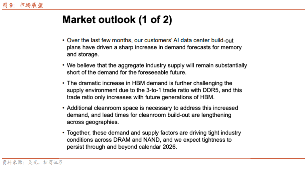过去几个月,客户的AI数据中心建设计划推动内存和存储需求预测大幅上调,行业总供应在可预见的未来将持续显著低于需求。HBM需求的激增进一步加剧了供应压力,其与DDR5的产能占用比例为3:1,且未来几代HBM的这一比例还将进一步提高,而全球范围内洁净室建设的交付周期不断延长,制约了供应能力的快速提升。