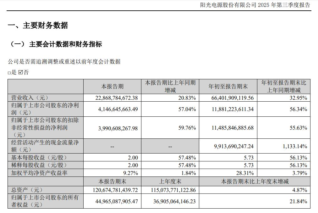 2025年第三季度,阳光电源实现营业收入228.69亿元,同比增长20.83%;归属于上市公司股东的净利润41.47亿元,上年同期归属于上市公司股东的净利润26.4亿元,同比增长57.04%;基本每股收益2元。