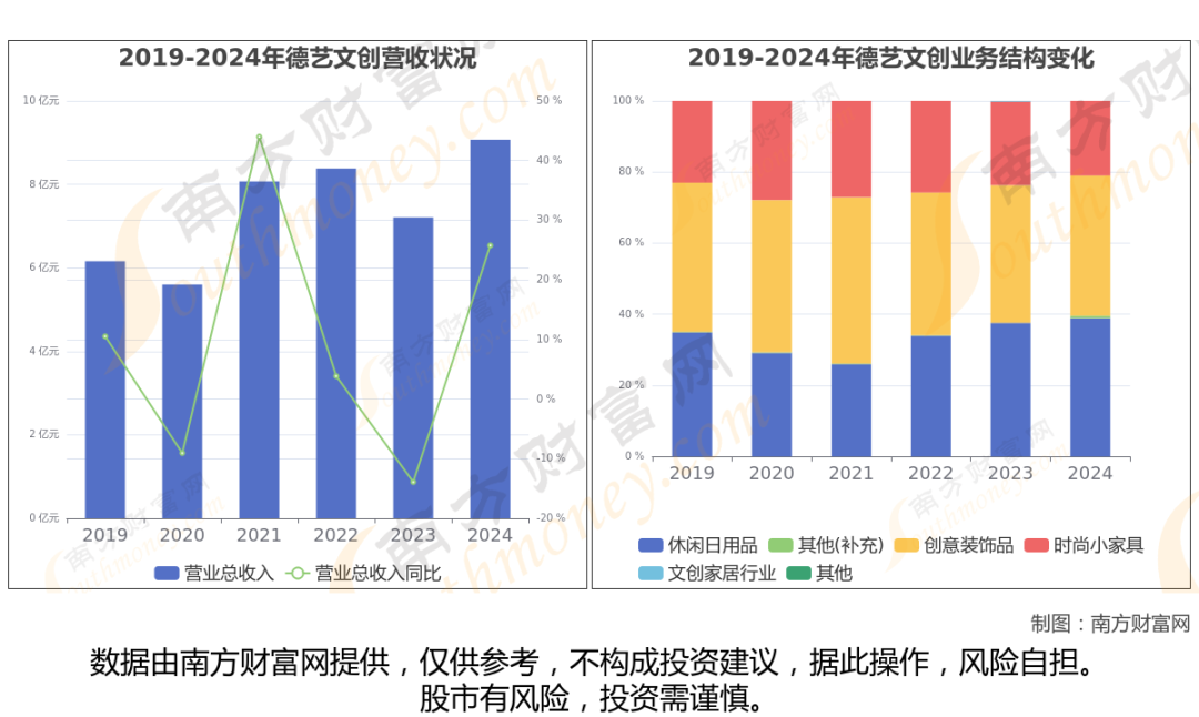德艺文创于2017年4月17日在深圳证券交易所上市,公司主营业务为为海内外客户提供研发设计、外包生产及全球化销售一站式服务。