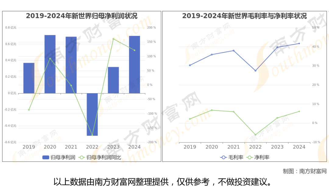 新世界年报数据显示(如上图),2024年实现营业总收入11.2亿,同比增长-1.21%,近5年复合年增长率1.72%。