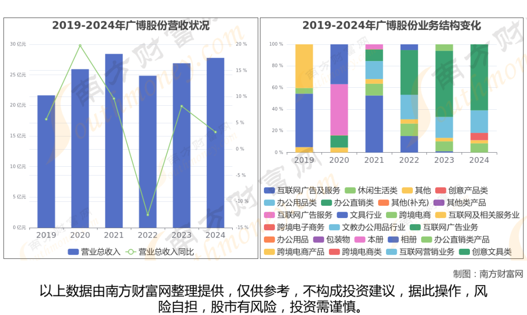 广博股份于2007年1月10日在深圳证券交易所上市,公司主营业务为公司文教办公用品业务、互联网营销与服务业务、跨境电商业务。