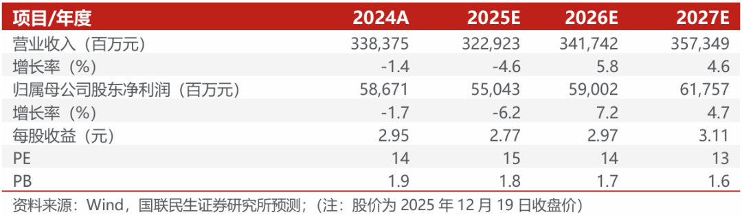 公司经营稳健、通过资产注入优化资源配置,不考虑本次资产重组,我们预计2025-2027年归母净利润为550.43/590.02/617.57亿元,对应EPS分别为2.77/2.97/3.11元,对应2025年12月19日股价的PE分别为15/14/13倍。维持“推荐”评级。