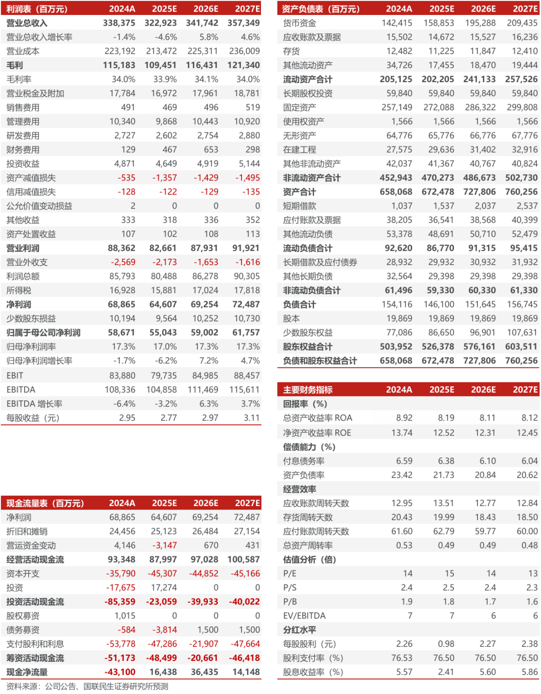 2022-2024年,公司实际分红比例达72.8%/75.2%/76.5%,均高于承诺比例下限60%。2025-2027年度股东回报规划中,公司将承诺分红比例下限进一步提升至65%,并提出酌情实施中期利润分配。2025年公司派发中期股息,且分红比例达到79.0%。因公司注重保持利润分配政策连续性、稳定性和可预期性,我们预计收购事项或不会影响公司分红承诺,未来仍有望维持全年75%左右的较高比例。不考虑募集配套资金,我们以收购后2024年和2025年1-7月年化的扣非归母净利润668.51/559.49亿元、75%的分红比例以及2025年12月19日A/H股收盘价分别测算,2024年利润对应的A/H股息率为5.8%/6.6%,2025年为4.9%/5.5%(汇率1HKD=0.91RMB)。