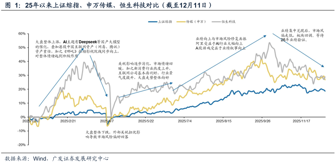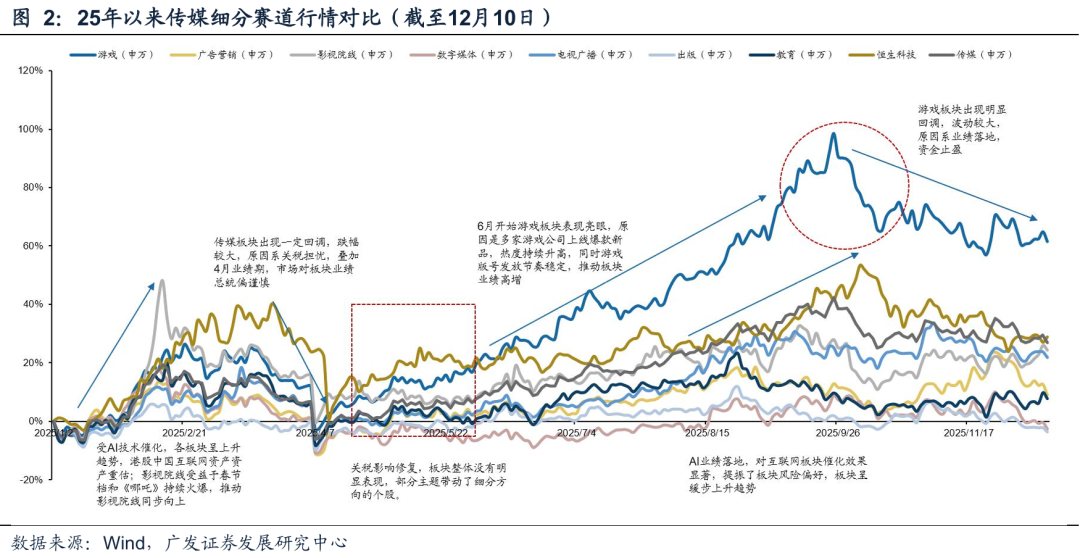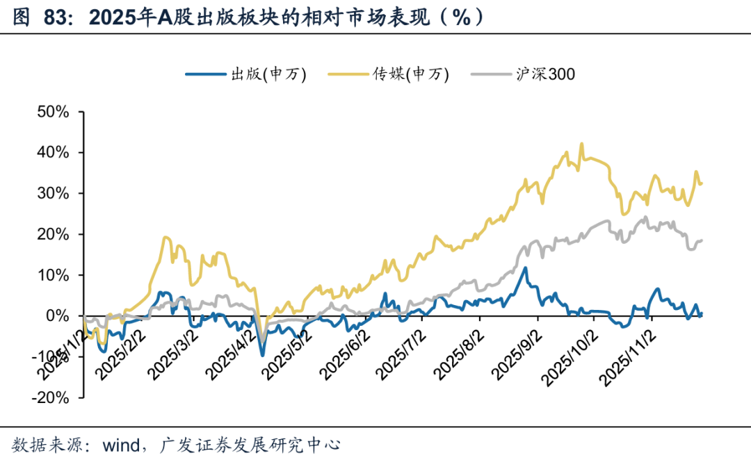 从细分赛道表现来看,今年是表现分化的一年;2月份影视院线板块由于《哪吒2》的推动有过突出表现,后续略有回落。全年恒生科技由于AI以及自身基本面的驱动上半年与下半年都曾有突出表现,截止11月底涨幅仅次于游戏板块。此外游戏板块涨幅明显高于传媒指数高于其他,回过头来看是游戏涨幅带动了A股传媒板块整体H2的表现(本质还是交易业绩)。