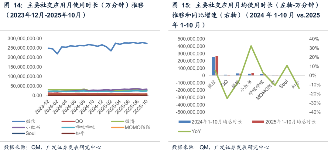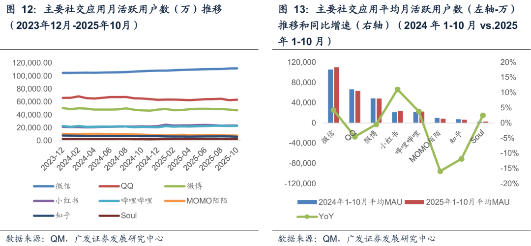 流量端:社交平台粘性较强,我们复盘qm统计月活跃用户数,2025年1-10月平均值来看,微信达到11亿,QQ达到6.35亿,微博达到4.84亿,小红书达2.38亿,哔哩哔哩达2.25亿,陌陌为8478万,知乎为6513万,Soul为2712万;如果看同比去年1-10月均值,微信同比增长4%,QQ同比下降4%,微博同比持平,小红书同比增长11%,哔哩哔哩同比增长4%,陌陌同比下滑16%,知乎同比下滑12%,Soul同比增长3%。
