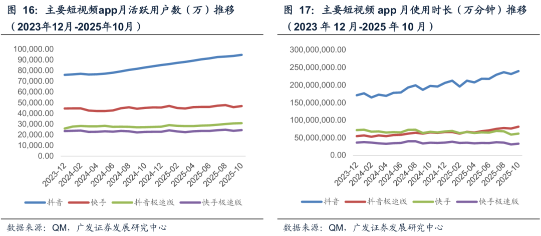 流量端:我们复盘QM统计月活跃用户数,2025年1-10月平均值来看,抖音达到9.07亿,快手达到4.62亿,抖音极速版达到2.91亿,快手极速版达2.37亿,如果看同比去年1-10月均值,抖音同比增长15%,快手同比增长5%,抖音极速版同比增长6%,快手极速版同比增长3%。2025年1-10月均时长来看,抖音和抖音极速版同比增长21%/20%,快手和快手极速版同比变动为-4%/-2%。
