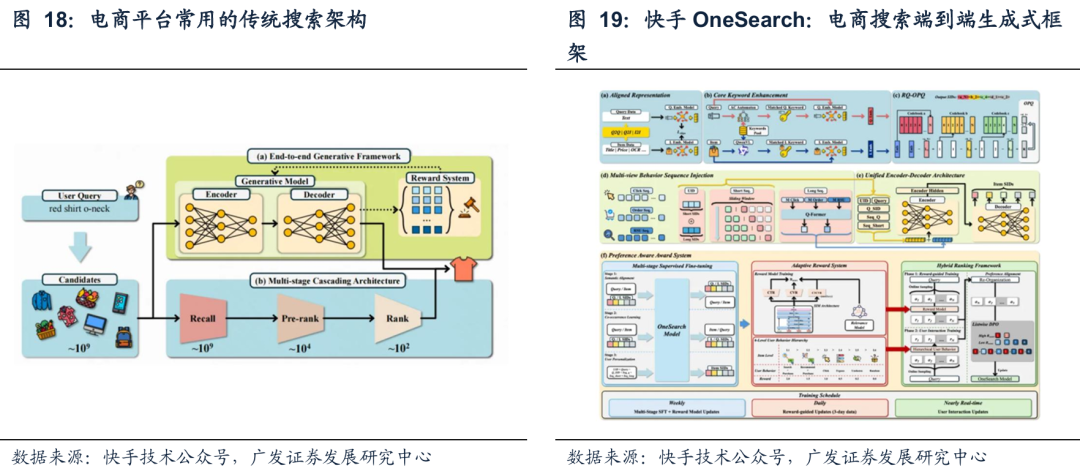 我们根据快手技术公众号发布的信息,对比电商平台常用的传统搜索架构,和快手OneSearch端到端搜索机制的不同。(1)传统搜索架构:采用召回->粗排->精排的架构。召回层,是在用户输入搜索词的时候,系统从商品库中筛选出包含相关搜索词的商品,追求快和全,精准度不高;粗排层,系统用轻量级模型对上万个sku进行粗略排序,去除明显不相关的商品。精排层,采用更为复杂和精细的模型进行剩余几百个商品的最终排序,会综合考虑点击率、销量、价格、用户偏好等因素。(2)快手推出了电商搜索端到端生成式框架,OneSearch,该框架包括三个创新点,第一,设计了关键词增强层次量化编码模块,对商品相关性约束进行了增强(每个商品由5层sid构成,为每个商品构建了语义层次丰富的“智能身份证“);第二,设计多视角用户行为序列,依据用户短期和长期行为,标注行为驱动的用户标识(UID),对用户偏好进行准确的建模;第三,增加了感知奖励系统,可以调整和激励模型的学习机制,捕捉到用户更细维度的偏好,增强模型的个性化排序能力。