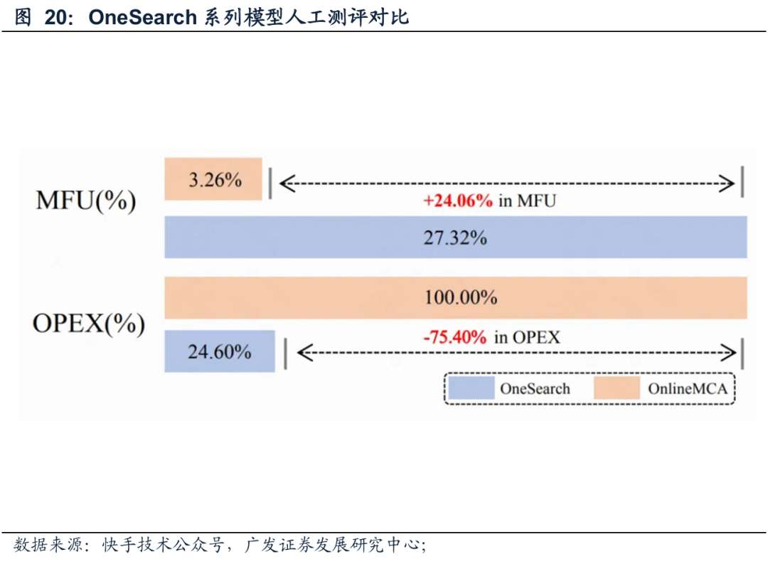 根据快手技术公众号的信息, OneSearch 系列模型在人工评测中,在多个指标,包括页面整体满意度、商品质量及query-item相关性等方面,均好于传统线上级联式系统。在线性能方面,机器计算效率(MFU)从 3.26% 提高到 24.06%;线上推理成本(OPEX)降低 75.40%,有助于资源利用效率的进一步优化。