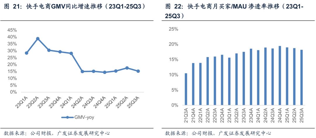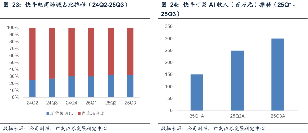 快手广告由内循环(电商)和外循环共同驱动,25年来看,内循环的表现更为稳健,基本保持和电商GMV增速同步。