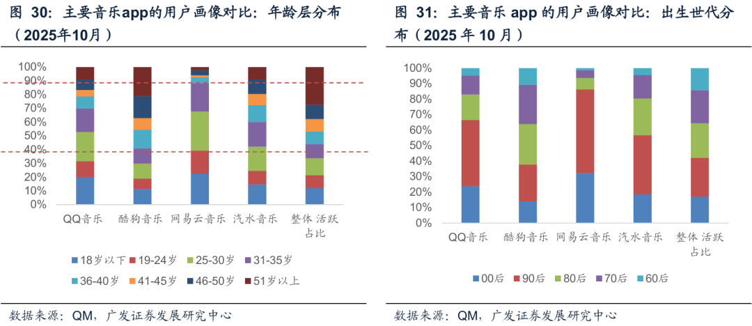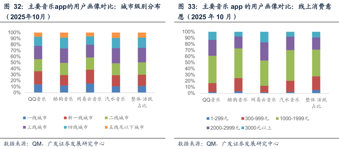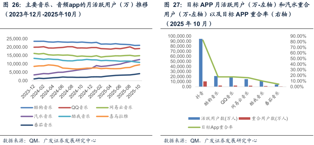 流量端:音乐赛道趋于成熟稳定。几个主要的音乐/音频APP,从qm的统计来看,2025年1-10月MAU的均值,酷狗音乐为2.17亿,QQ音乐为1.93亿,网易云音乐为1.47亿,汽水音乐为1.02亿,酷我音乐为1.17亿,喜马拉雅为7816万,对去年同期均值的同比增速来看,酷狗音乐YoY-6%,QQ音乐YoY-3%,网易云音乐YoY-4%,汽水音乐YoY 98%,酷我音乐YoY-6%,喜马拉雅YoY-4%。