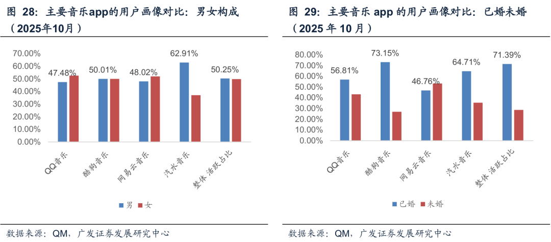 整体来看,各个应用之间的用户在性别和年龄及城市分布上各有侧重,各个应用在用户年龄层上的构成差异>城市级别构成分布差异。性别构成来看,汽水的男性用户偏多,QQ音乐和网易云音乐的女性用户略多。网易云音乐和QQ音乐的未婚用户占比也明显高于其他产品。年龄层来看,24岁以下用户占比最高的是网易云音乐、QQ音乐;35岁以上用户占比最高的是酷狗音乐和汽水音乐。城市级别来看,也是网易云音乐和QQ音乐的一线及新一线城市占比更高,下沉占比更低。