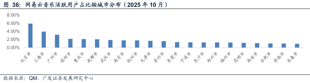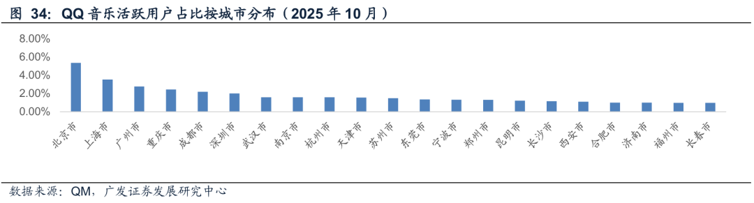 我们按QM披露的各个应用活跃用户的城市占比来看,QQ音乐的前五大城市是北京、上海、广州、重庆和成都。