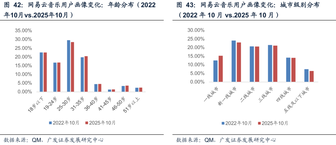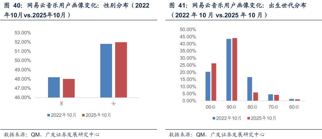 网易云音乐2025年10月的用户画像和2022年20月相比,女性占比略有提升,00后占比增加,80后占比下降。在一线城市的用户占比也有所提高。