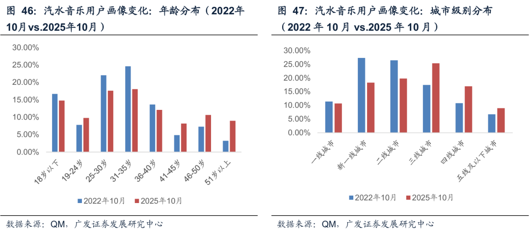汽水用户的构成,从25年和22年的对比来看,更多是在更下沉城市获取了更年轻和更高龄的用户。汽水音乐2025年10月的用户画像和2022年20月相比,女性占比略有提升,00后占比增加,90-80后占比下降,70后和60后占比提升。在高线城市的用户占比也有所下降,下沉市场的占比有所提升。