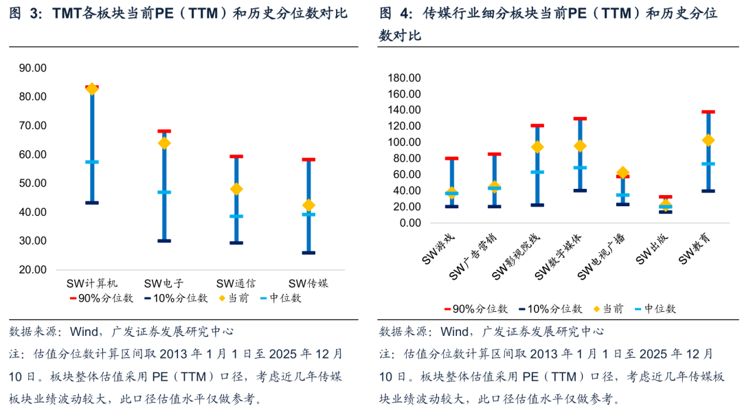从估值水平来看,相较于TMT其他方向,当前传媒板块整体估值处于历史中位数区间。根据Wind,当前传媒(申万)板块PE(TTM)处于历史中位数区间,电视广播等细分方向处于历史较高估值区间;而游戏尚处在中位数(今年涨的主要是业绩)。